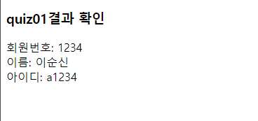 <p>회원정보확인 링크에는 quiz_result01?키=값 형태로 회원번호, 이름, 아이디 을 넘겨주세요 아래